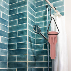 - Enganche el estante de secado en una varilla o barra segura en un área que no se dañe con el agua, como un toallero de baño o manijas de ducha. NO lo coloque sobre o cerca de equipos o fuentes eléctricas.