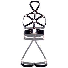 Explora tus deseos más íntimos con un toque de atrevida elegancia mientras disfrutas del deleite y la autoridad de nuestro arnés corporal con tachuelas y junta tórica de cuero vegano. Los atractivos tachuelas con junta tórica, las ligas conectadas y el asa trasera removible revelan la faceta aventurera de su personalidad, invitando a un viaje encantador hacia el control sensual.